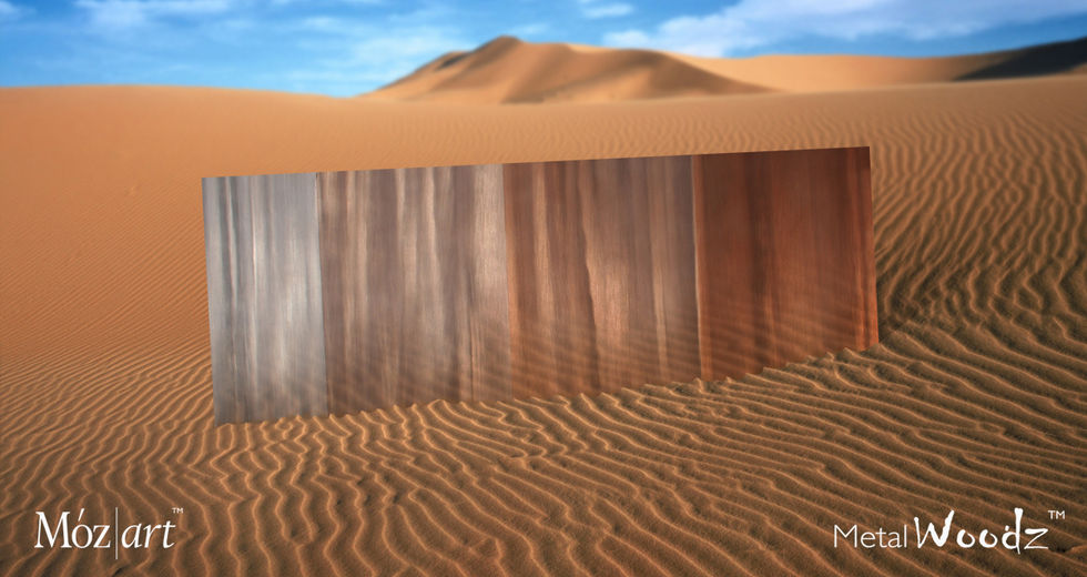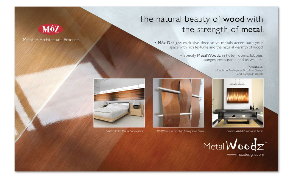 Using the forces of nature as inspiration for Móz Metal Woodz new palette photography and marketing concepts. Earthy tones of brass, bronze, and copper form the foundation of native metals and natural wood that inspire new color offerings. Designers can now achieve the look of naturally-weathered steel or aged brass with appearance of wood using Móz lightweight solid-core aluminum materials.
