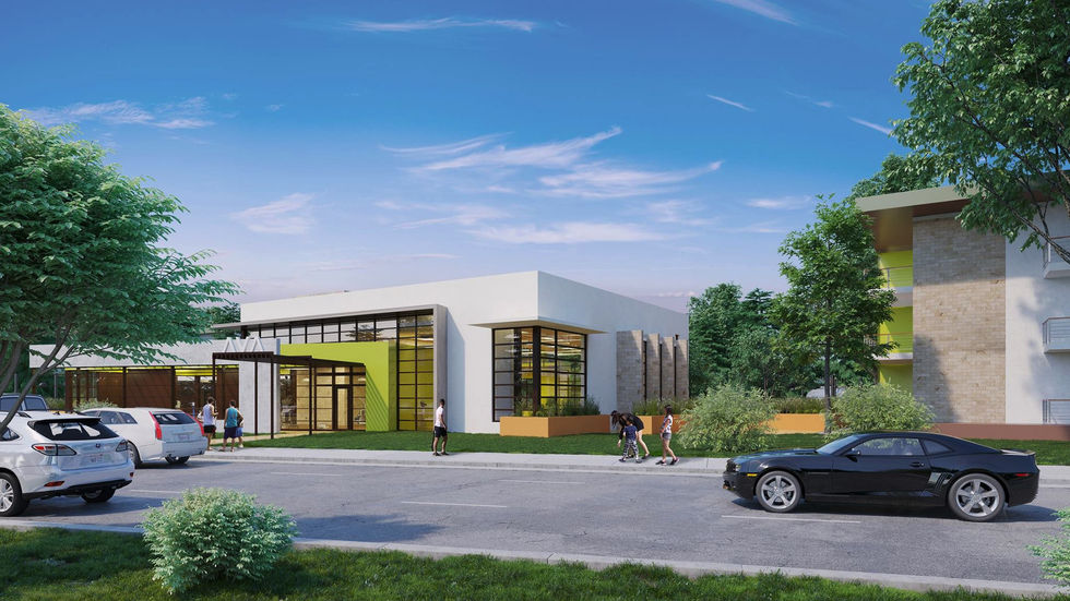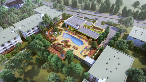 Apartment buildings with amenities, including a pool, spa, BBQ, and picnic area